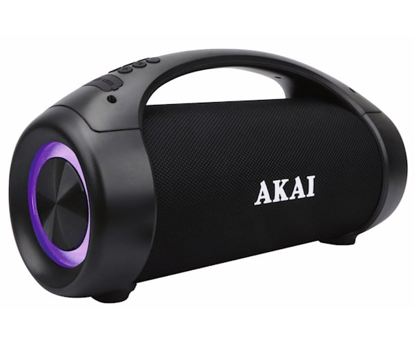 Odavno je poznato da je oblik cilindra jedan od najzahvalnijih za prenosive zvučnike, a Akai je rešio da igra na sigurno, pa se ABTS-55 odlikuje valjkastom formom. Kućište je presvučeno izdržljivom tkaninom, dok su rubovi obloženi čvrstom plastikom, s integrisanom ručkom na gornjoj strani. Prednja i zadnja strana zvučnika razlikuju se samo po logotipu kompanije, jer su komande i priključci postavljeni u korenu ručke, što predstavlja vrlo praktično rešenje. Garnitura komandi je kompletna i obuhvata uključivanje, odabir izvora, kontrolu glasnoće i reprodukcije, kao i upravljanje svim drugim opcijama, a uz tastere se nalazi niz od četiri sitne LE diode, koji služi za indikaciju napunjenosti interne baterije. Priključci su smešteni ispod gumenog poklopca, jer je ABTS-55 vodootporan po standardu IPX5, a ovde pronalazimo USB-C port za punjenje baterije, USB-A port za priključivanje eksternih skladišta i dodatni analogni 3,5-milimetarski ulaz, koji se sve ređe sreće kod blutut zvučnika. Pregled spoljašnjosti završavamo na bokovima, koji su opremljeni pasivnim ravnim membranama za snažniji bas – membrane su uvučene u plastični obrub, pa su donekle zaštićene od udaraca, a providno vešanje ujedno služi za svetlosne efekte.