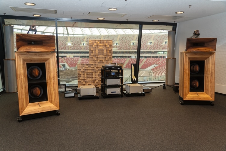 Još jedni zvučnici s neverovatnom cenom – Blumenhofer Acoustics Gran Gioia 2 x 16 koštaju 270.000 evra! Vlasnik ovog brenda i konstruktor je takođe jedne godine posetio naš sajam u Beogradu, a u Varšavi je uspeo da osvoji srca publike. Sistem je pokretala Ypsilonova elektronika (pretpojačalo i snagaš), zatim Cary DMS-800 mrežni plejer, a za kablove je bila zadužena kompanija Cammino sa svojom Reference serijom. Svakako jedan od tri najbolja sistema koje smo čuli u Varšavi.