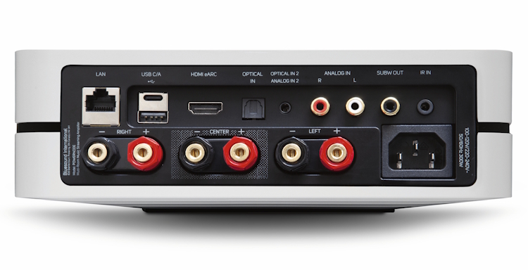 U pogledu upotrebljivosti POWERNODE sadrži strimer, D/A konverter i amplifikaciju u jednom kućištu, a opseg mogućnosti najbolje se vidi na zadnjem panelu. Za priključivanje digitalnih izvora prisutni su optički i USB-C, kao i kombinovani digitalno-analogni u formi 3,5-milimetarskog ulaza, dok je za integraciju televizora predviđen HDMI eARC. Za analogne izvore dostupan je još jedan RCA ulaz, ali treba imati u vidu da se analogni signal prevodi u digitalnu formu, što nije najsrećnije rešenje. Tu je i USB-A port za priključivanje eksternih skladišta za funkciju muzičkog servera, dok se povezivanje na lokalnu mrežu obavlja preko eternet porta ili wi-fija. Ispod priključaka za izvore smešteni su terminali za tri zvučnika, što je prilično neobično, ali će biti razjašnjeno kasnije. Postavka se završava IEC utičnicom za odvojivi strujni kabl i priključkom za eksterni senzor daljinske komande ukoliko poželite da postavite POWERNODE na zadnji deo police. Najzad, Bluesound već dugo neguje takozvani plutajući dizajn, što znači da se uređaj oslanja na jednu uvučenu površinu u središtu donje strane, koja je teže primetna spolja. Na donjoj strani takođe pronalazimo veliki broj proreza za hlađenje.