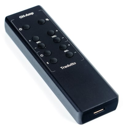 Uprkos malom broju komandi, skromna površina prednjeg panela deluje prilično popunjeno, a središnju poziciju zauzima omanji OLED ekran – ponovo, kao kod srodnog Tradutta. Levo od njega postavljeni su izlazi za slušalice u obliku 6,35-milimetarskog i balansiranog 4,4-milimetarskog priključka, dok se na desnoj strani nalaze tasteri za odabir opcija i podešavanje fiksnog pojačanja (gain), senzor daljinskog upravljača i višenamenska kružna komanda, koja služi za uključivanje i kontrolu glasnoće. Zadnja strana uređaja jednako je popunjena, pa ovde pronalazimo dva linijska RCA ulaza i jedan balansirani 4,4-milimetarski ulaz – jer je CH-Amp suviše mali da bi udomio XLR priključke punih dimenzija. Na izlazu su postavljeni po jedan RCA i balansirani 4,4-miimetarski priključak, a postavku kompletira četvoropinski konektor za eksterno napajanje.