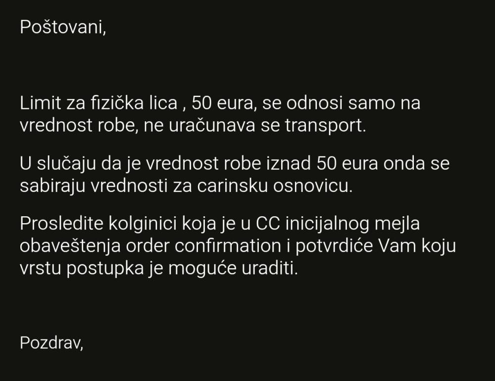fege Posted June 5, 2018 Report Posted June 5, 2018 Ako je cena tih 12 ploča bila veća od 50 evra, onda se na tu cenu dodaje postarina, pa na ukupnu cenu carina udara svoj haračSent from my LG-D855 using Tapatalk Quote