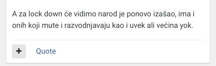 Bendtner Posted July 6, 2020 Report Posted July 6, 2020 1 hour ago, džonibigud said: Thecoki se potrudio. Otišao, poslušao. Zabeležio lepe fotografije, napisao interesantan tekst u kome je izneo svoje utiske i hvala mu na tome. A sada da te pitam, da li si ti napisao nešto interesantno pa da obratim pažnju na to? Evo probaću: 2500, 3000, 2700, 3500 ... Quote