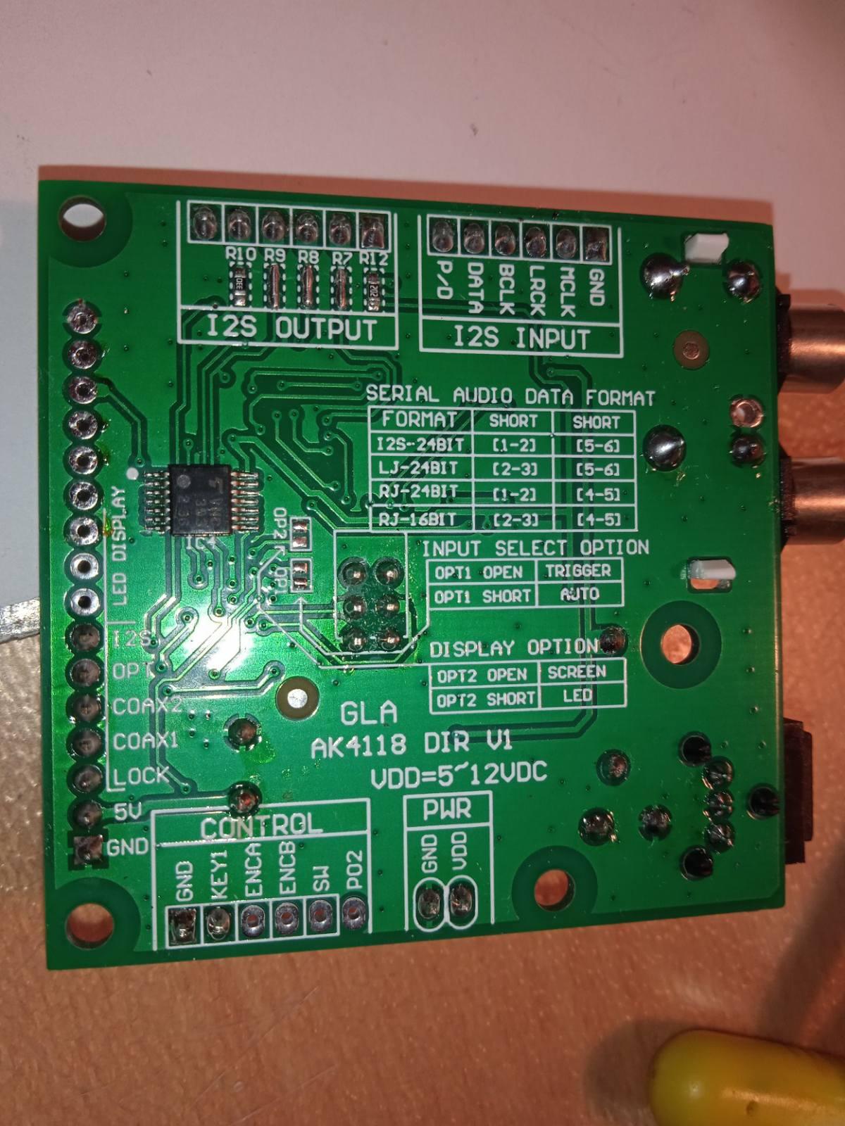 Nixie Posted February 7, 2024 Author Report Posted February 7, 2024 Za vas koji koristite SPDIF/TOSLINK kartice sa AK4113/4118 pogledajte odozdo šta je na I2S izlazu ka DAC-U. Tu se nalaze otpornici 330-470ohm kako na kojoj pločici. To je previše i ne utiče dobro na zvuk. Skinuto je i stavljeni su jumperi. R7, R8 i R9 treba premostiti za Miro & Pavouk DAC-ove (LRCK, DATA & BCK). Radi bez greške (testirano na 384kHz SR) i zvuk je čistiji. Quote