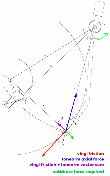 Nixie Posted June 11, 2024 Report Posted June 11, 2024 Antiskating korekcija je sila kojom se kontrira sili koja se stvara zbog toga što je sila trenja igle u brazdi pod nekim uglom u odnosu na osu ručice. Sila trenja je uvek tangencijalna na prečnik brazde. Kad se sila trenja projektuje na osu ručice i upravno na osu, dobiju se dve komponente. Jedna nije problematična, ona u osi, a problematična je ona upravno na osu, ona vuče sve ka centru rotacije. Osa ručice je virtuelna, kreće iz vertikalne ose ležaja i završava se u vertikalnoj osi igle, bez obzira na oblik ručice. Znači čista geometrija. Kod tangencijalne ručice, sila trenja je u osi ručice i nema bočne komponente. Quote