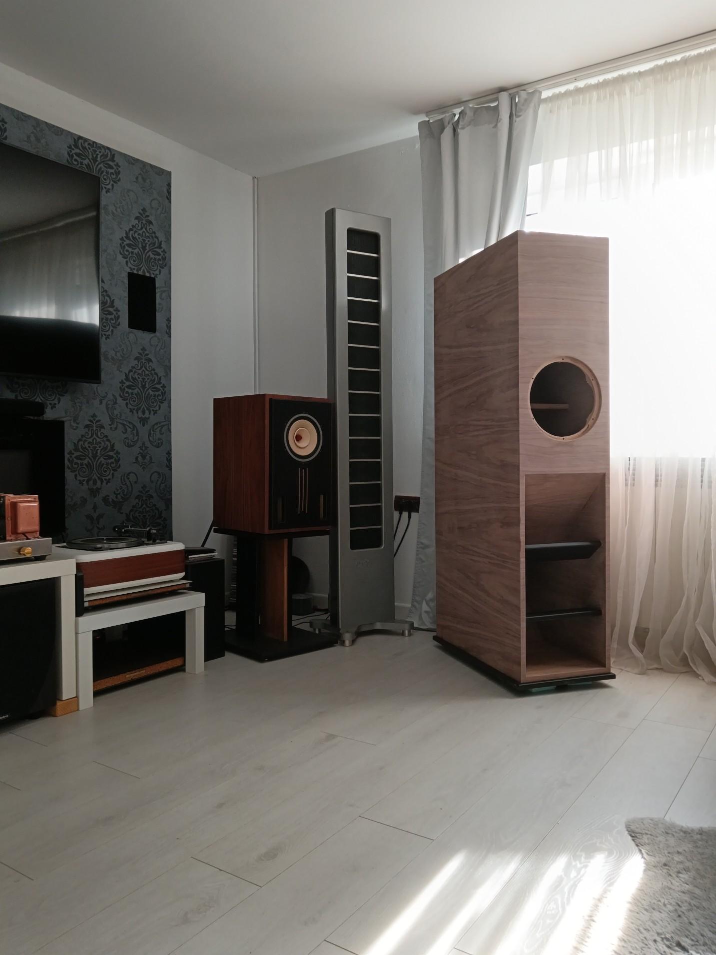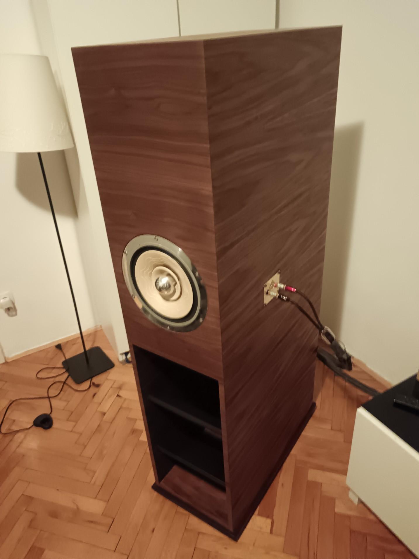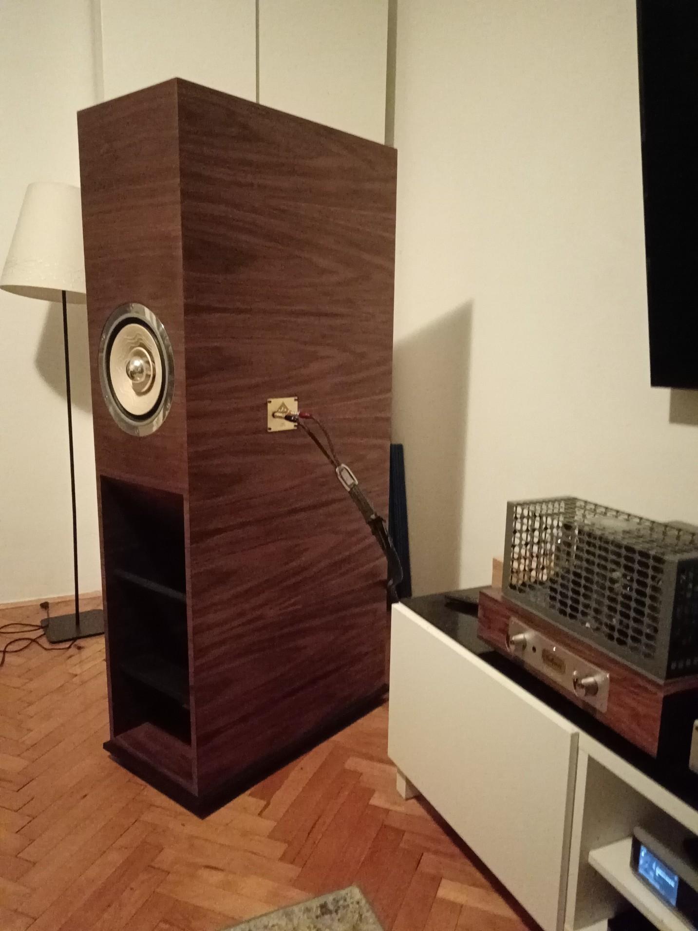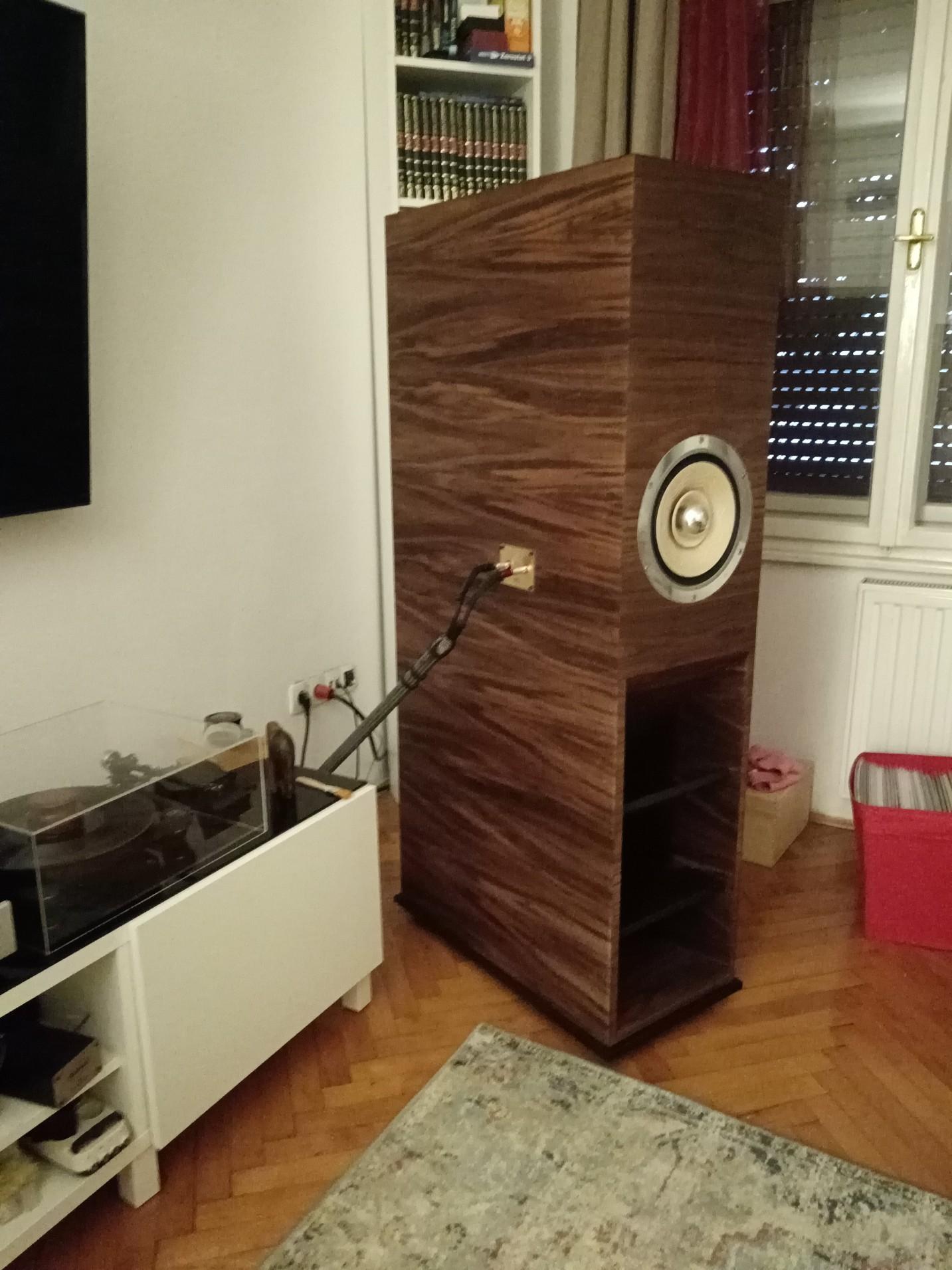 Dacho Posted October 1 Report Posted October 1 Možda po nekima ovaj zvučnik i nije baš referenca ali ljubiteljima zvuka širokopojasnih drivera će se ovo svakako svidjeti. Moram priznati da je ovo bio jedan od zahtijevnijih projekata sto sam radio i to po mnogim stvarima. Zvučnik je napravljen po službenim nacrtima J. Decware koji je zaštitio ovaj projekat posebno za Lii Audio i nacrt se plaća nesto vise od 100 eura. Postavit cu ako vas zanima kasnije link na njegove stranice i forum kako se ovo razvijalo i cijeli projekat nastao. Koliko mi je poznato ovo je jedna od prvih izvedni u europi osim jednog nizozemca koji ih je napravio prosle godine. Lyritec ili EU inacica ih na svojim sluzbenim stranicama nudi za cca 9000 eura sa driverima. Cijela prica se vrti oko brutalnog drivera Lii Audio Platinum 10, njihov referentni model vrlo visoke osjetljivosti i cijene od 2500 eura par. Jedan od rijetkih drivera koji ima osjetljivost preko 100 db, predimenzioniran motor (Qts mu je 0.107!!) i vrlo laku membranu. Driver je 10" i tezak je preko 10 kg. Cijela kutija je vrlo zahtjevna sa malo previše dijelova, doslovno skoro nigdje nema pravog kuta i impozantnih gabarita, visine preko 160 cm i 75 cm dubine. Zvuk je u skladu sa reputacijom, detaljan, dinamičan, realan sa impresivnim basom od 30 Hz. Zanimljivo je sto je zvucnik jako dobro izbalansiran tako da niske frekvencije rijetko dominiraju ali kod velikih orkestara pokažu svu svoju raskoš i autoritet gdje se kutije spustaju vrlo nisko. Svakako vrlo zanimljiva priča za cijevna pojacala male snage, posebno 300b. Quote