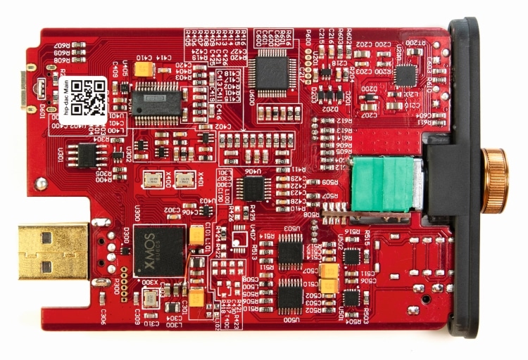 Pogled u unutrašnjost pokazuje da je hip-dac2 u celosti ispunjen štampanom pločom, koja sadrži komponente na obe strane. U srcu uređaja nalazi se konvertersko kolo DSD1793 renomiranog proizvođača Burr-Brown, koje iFi Audio koristi i u daleko skupljim spravama, kao što su xDSD Gryphon i referentni Pro iDSD. U blizini je smešten 16-jezgarni mikrokontroler XMOS, koji služi za prijem i obradu digitalnog signala preko USB veze, a iFi Audio je razvio firmver koji obezbeđuje optimalnu spregu s DAC kolom. Stepen za amplifikaciju izveden je u balansiranom dizajnu i opremljen kvalitetnim komponentama, kao što su TDK keramički kondenzatori, napajanje niskog šuma iz kompanije Texas Instruments ili prilagođeni operacioni pojačivači, uz podešavanje glasnoće u analognom domenu. Pored toga, hip-dac2 donosi tehnologiju S-Balanced, koja se može naći kod skupljih iFijevih modela i pruža određene prednosti balansirane veze, ali preko standardnog 3,5-milimetarskog priključka. Konkretno, proizvođač tvrdi da su na ovaj način izobličenja i preslušavanje kanala umanjeni za 50 odsto. Konačno, na poleđini štampane ploče smeštena je litijum-polimerska baterija za napajanje uređaja, koja ima kapacitet 2.200 miliamper-sati.