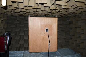 Nama je, naravno, najzanimljiviji deo prezentacije bio poseta anehoičnoj prostoriji, u kojoj se vrše merenja zvučničkih jedinica. Prostorija je na svim zidovima obložena sunđerima neobičnog trouglastog oblika da bi upila sve refleksije. Takođe, čak je i pod akustički tretiran, tako da se laboranti zapravo kreću po metalnoj mreži na oprugama. Zvučnička jedinica se postavlja na veliki drveni panel, a mikrofon usmerava ka sredini membrane. Zatim svi napuštaju ovu prostoriju zatvarajući veoma velika klizna vrata, koja sa svoje unutrašnje strane imaju istu strukturu sunđera. U laboratoriji koriste Clio 8 sistem za merenje, a sam proces merenja traje veoma kratko.