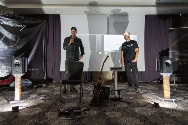 U najvećoj prostoriji hotela „Double Tree“ promociji je prisustvovalo oko stotinu posetilaca, koji su nestrpljivo čekali da prođe kratka tonska proba i da zauzmu svoja mesta. Vlatko Stefanovski je postavio svoju akustičnu gitaru i pedal board, na kojoj smo prepoznali Boomerang III Phase Sampler, kao i Electro-Harmonix Freeze Sound Retainer. Za konačni zvuk Vlatko je koristio HX Stomp procesor kompanije Line6.